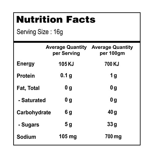 Water, Sugar/Glucose- Fructose, Mango Pulp,Vinegar, stabilizers : Carboxymethyl Cellulose (E466) & Xanthan Gum (E415), Salt, spices, Lemon juice Concentrate, Preservatives : Potassium Sorbate (E202) & Sodium Benzoate (E211).