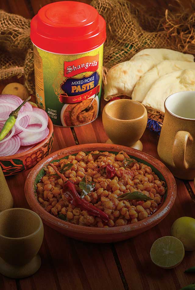 - Heat oil, add whole red chillies, yellow mustard seeds,cumin, Shangrila Pickle Paste and curry leaves.
