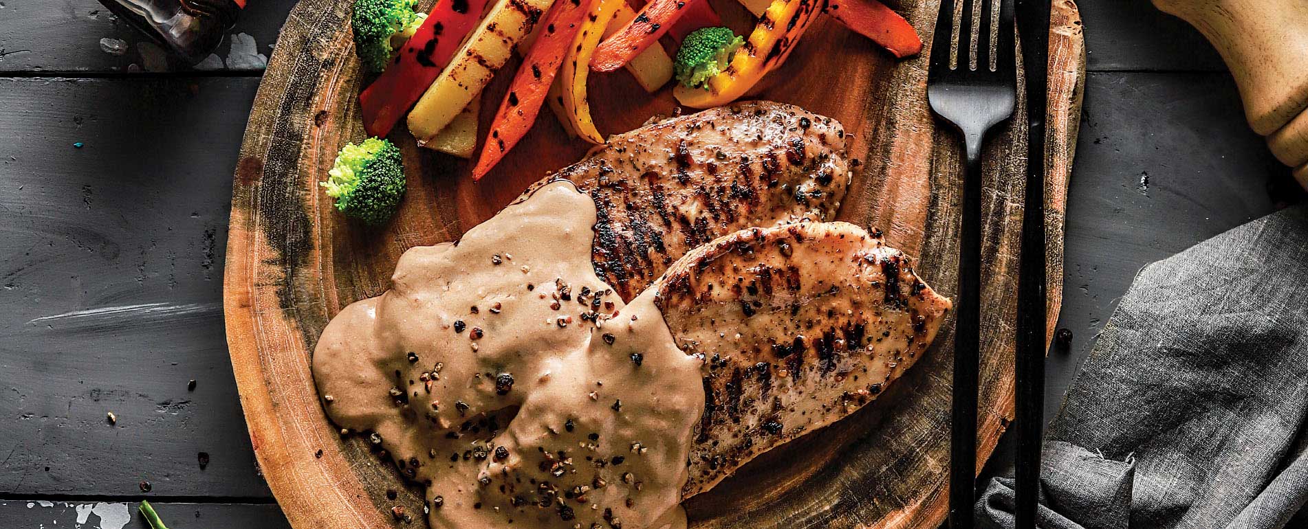 - Place prepared vegetables on one side. Pour black pepper sauce and then place the dipped chicken steaks on top of it.
