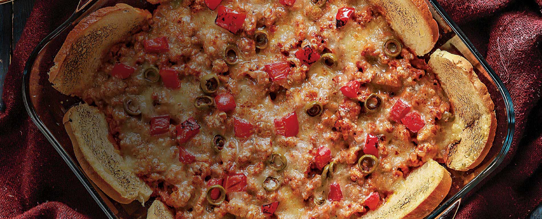 Heat oil in a pan and add ginger garlic paste with chopped onion. Fry for 2 mins, add beef mince with all Shangrila Sauces and seasonings and 1 cup of water, then cover and cook till meat is tender. Dish out the prepared beef mince and sprinkle cheese over it. Add in veggies, top with cheese, slice the bread into small pieces, fix at the corner of the dish and bake for 20 mins until the cheese melts. Serve immediately.