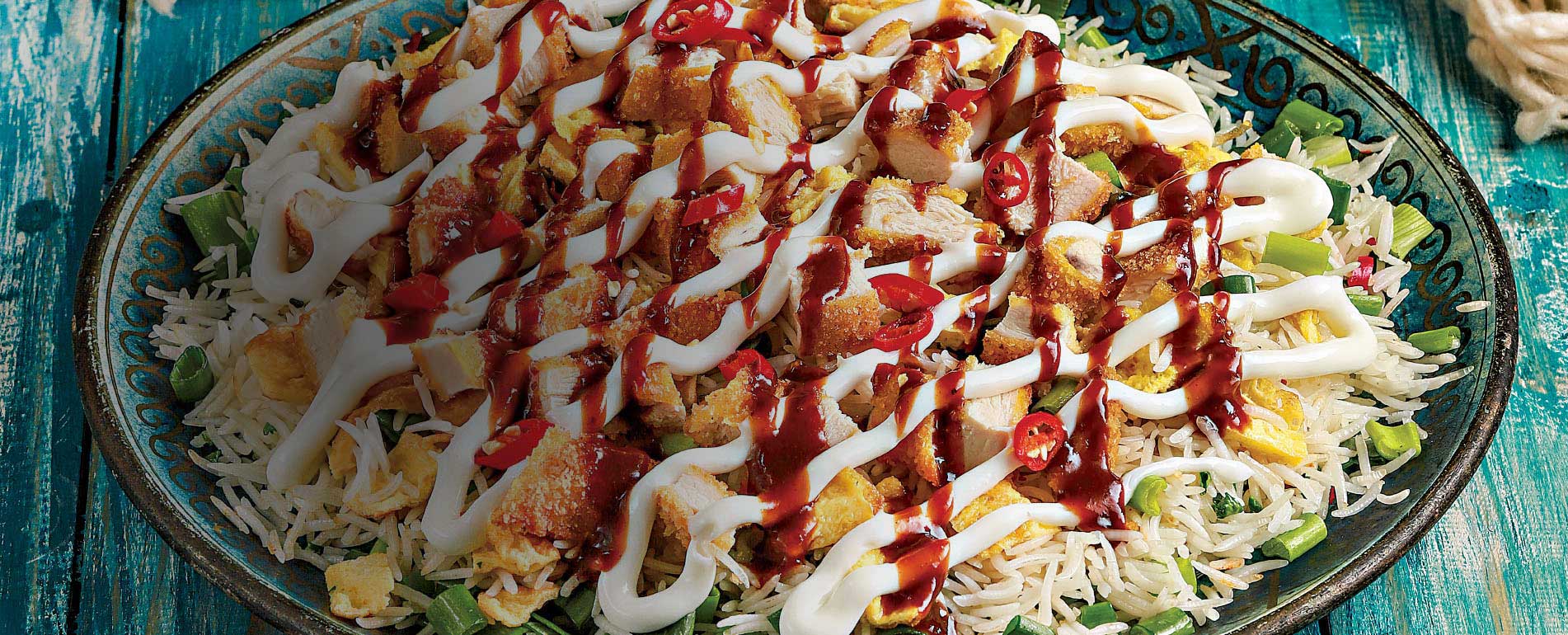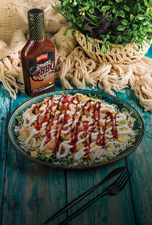 Pour oil in a pan and add carrots, capsicum, chicken cubes, Shangrila Soy Sauce, black pepper, salt, and eggs. Mix well and add boiled rice in the pan too. Add a small amount of water and then close the lid tightly. Leave to cook on low heat. Once cooked, mix crunchy chicken in the rice and serve with Shangrila Smoky BBQ sauce.