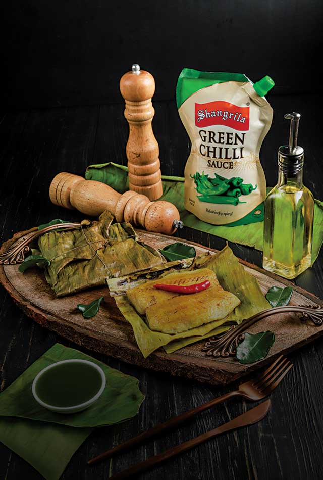 Marinate fish with salt, Shangrila Green Chilli Sauce and turmeric for half an hour. Grind mint, coriander, green chillies, desiccated coconut, cumin seeds, garlic with Shangrila Lemon Juice or Shangrila Vinegar adding very little water. Apply thick chutney on the fish pieces, wrap well in banana leaves and steam in a steamer till done.