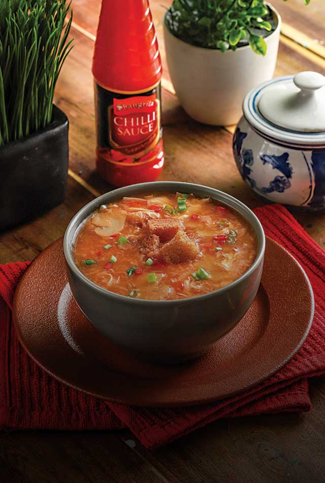 When mixture comes to boil, add dissolved corn flour in water for (thickening). In the end add Shangrila Vinegar and whisked eggs. Mix lightly and check the seasoning. If it requires more hot sauce, add 2 tbs of Shangrila Chilli sauce. Serve hot.