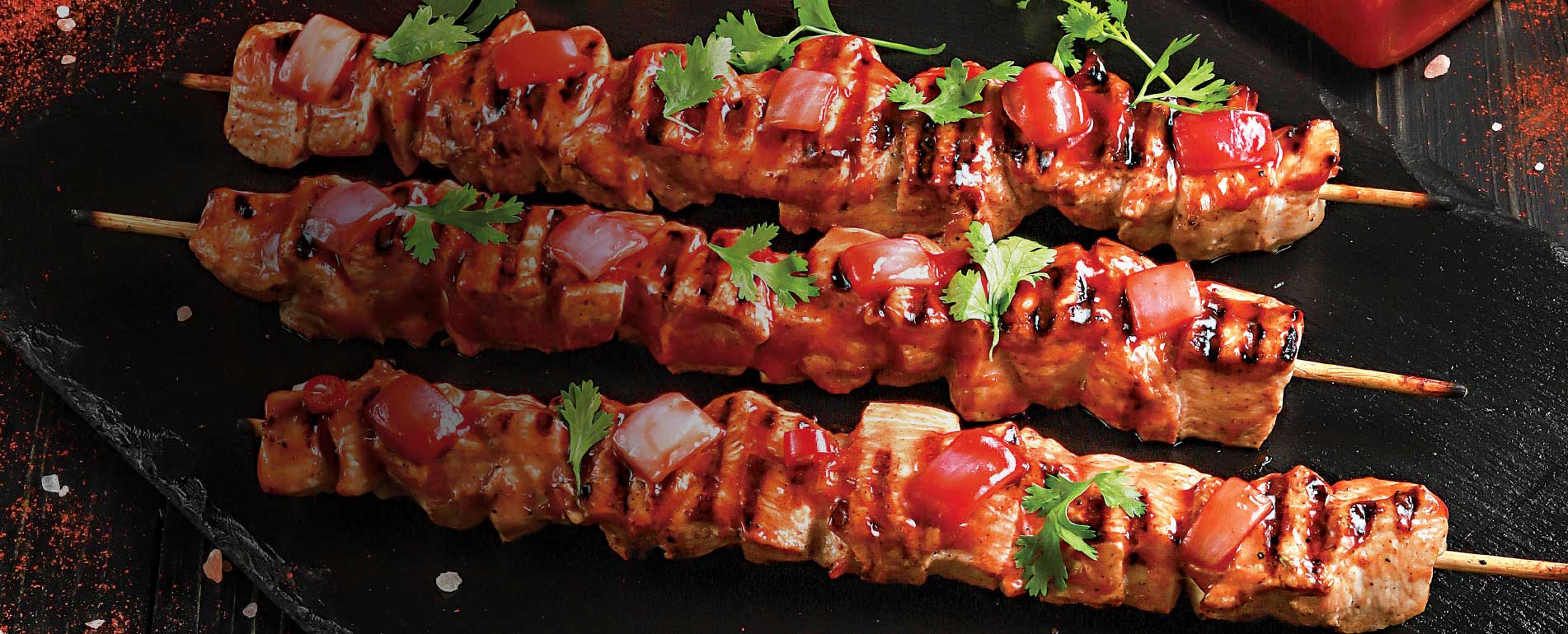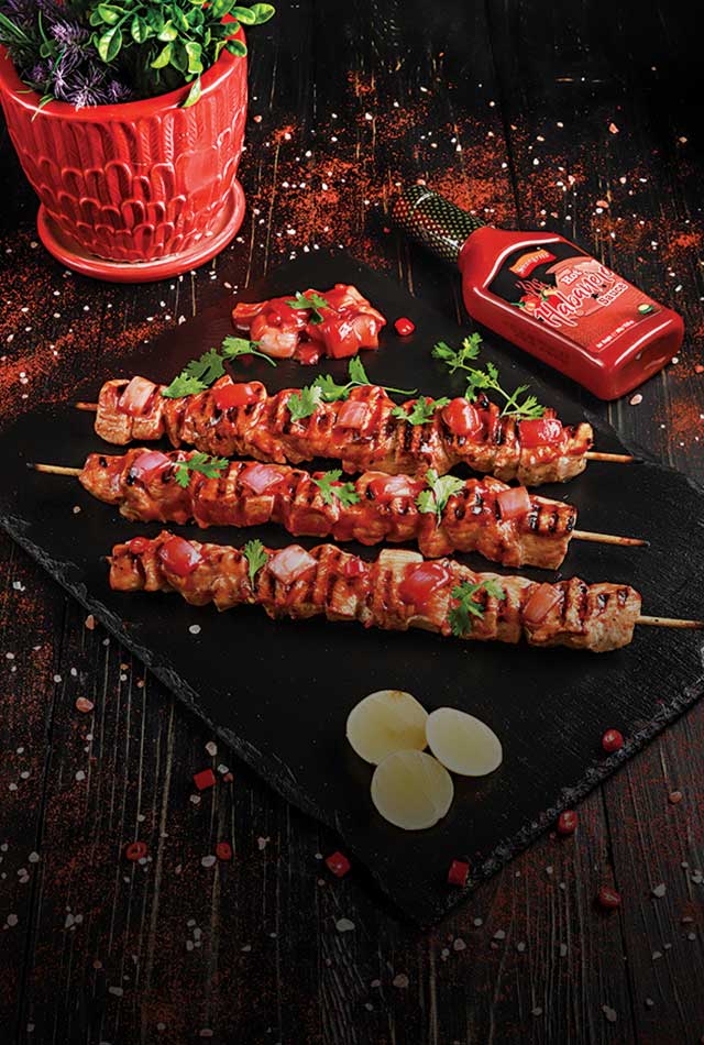In a bowl, add chicken, garlic, Shangrila Hot Habanero Sauce, salt, Shangrila Lemon Juice and chicken powder mix well and refrigerate for 1 hour. Heat a piece of charcoal, put it on aluminium foil and place it in the middle of the chicken. Pour 2 tbs oil on charcoal, cover for a minute and remove the charcoal. Mix the chicken well along with all ingredients and skewer the chicken on shashlik sticks. Heat 6 tbs oil in a pan and cook the chicken on medium heat for 8 to 10 minutes on both sides. Serve with vegetables.