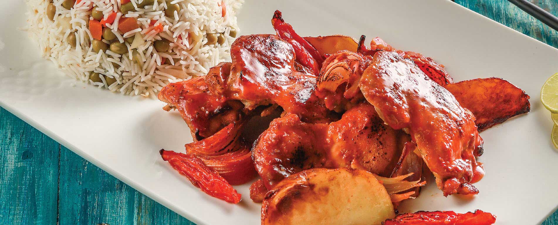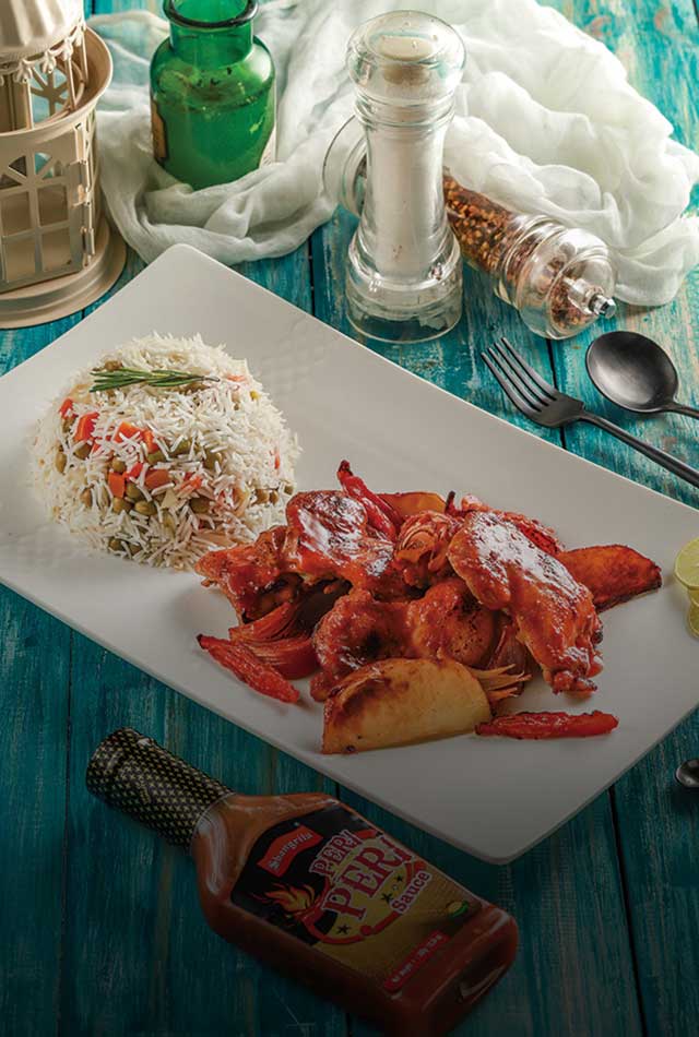 In a bowl, add chicken, white pepper, Shangrila Lemon Juice (2 tbsp), salt (1 tsp), garlic powder, Shangrila Hot Habanero Sauce (3 tbsp), Shangrila Peri Peri Sauce (3 tbs), and mix well. Refrigerate and marinate for 1 hr. In another bowl, add all the vegetables, remaining Shangrila Hot Habanero Sauce, Shangrila Peri Peri Sauce and Shangrila Lemon Juice, salt and mix well. Place vegetables in a baking tray and chicken legs over vegetables. Pour some oil and bake for 25-30 mins in preheated oven at 250°C.