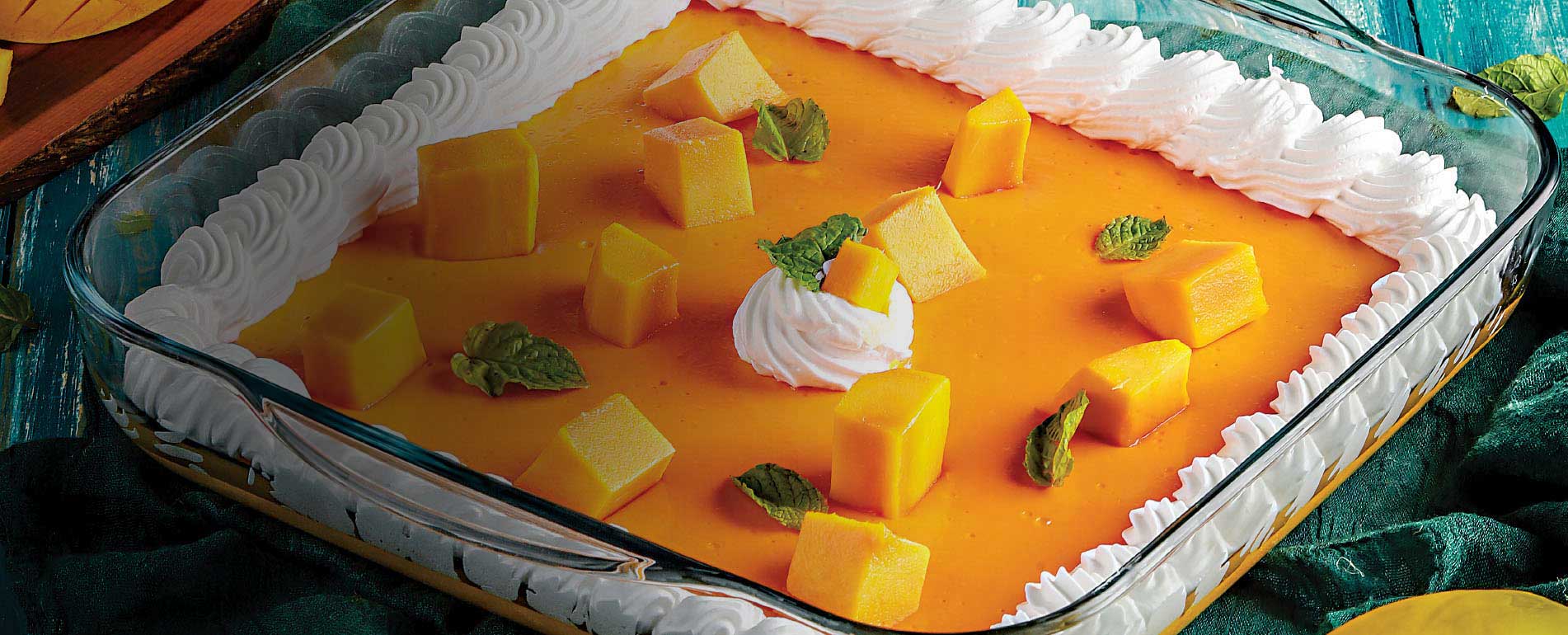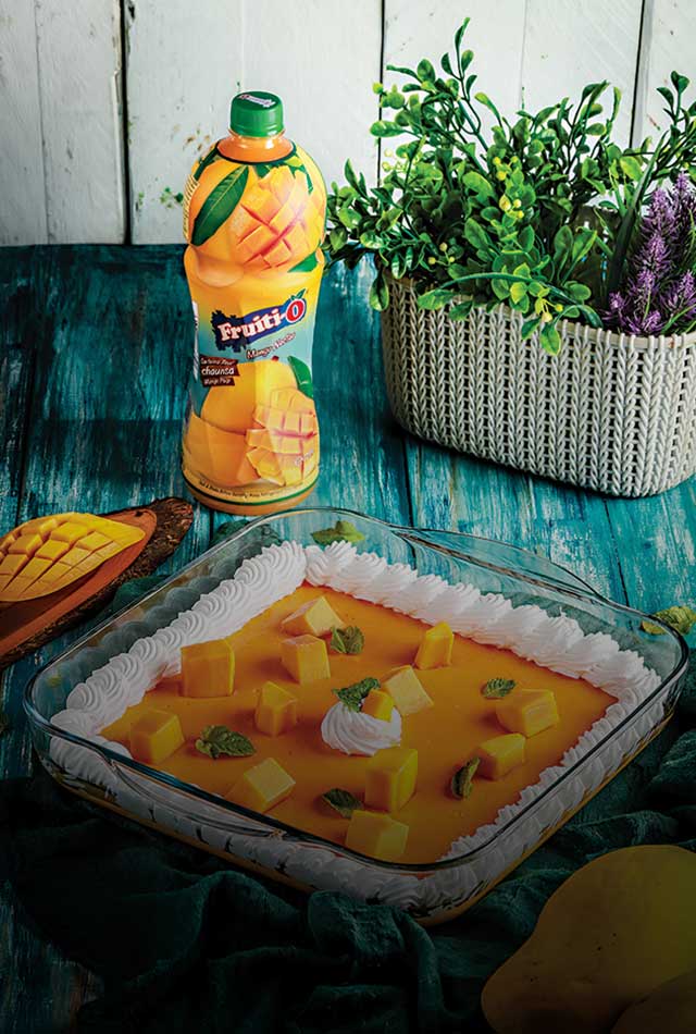 Meanwhile, prepare the custard, add mango cubes, and then add Fruiti-O Mango Nectar mixed with gelatin.
