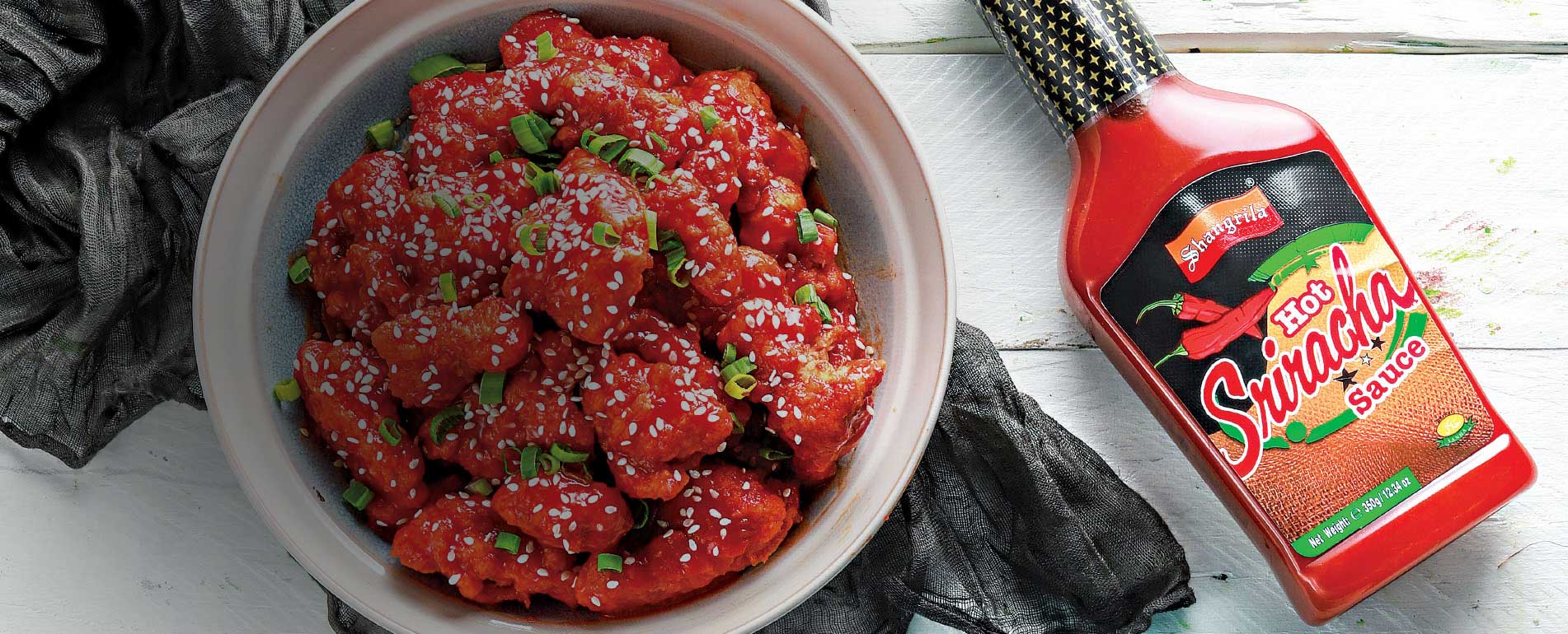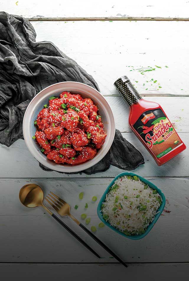 Coat chicken cubes with corn flour and deep fry. Now in another pan, add some oil and Shangrila Hot Sriracha Sauce, then add chicken and coat nicely. Now sprinkle some sesame seeds and spring onion. Serve hot.