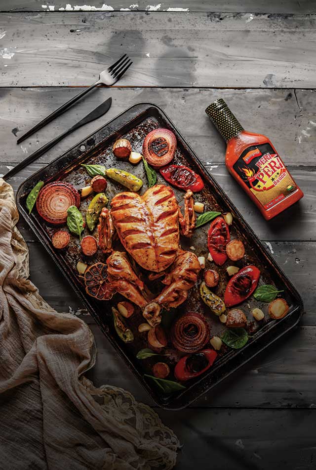 Mix one cup of mayonnaise, 4 tablespoons of Shangrila Peri Peri sauce, 1 teaspoon of Shangrila Vinegar, and 1 teaspoon of garlic paste to make garlic sauce. Serve the chicken with garlic sauce.